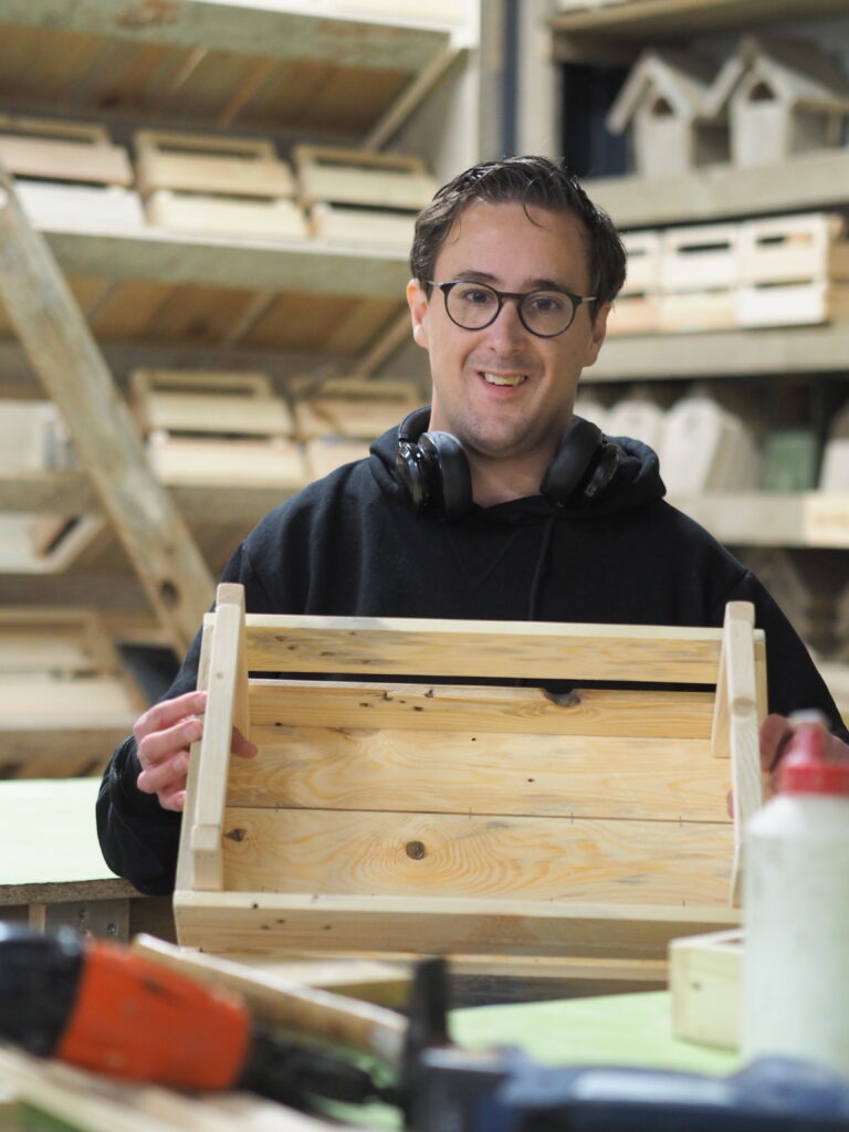 Naast werkzaamheden in de werkplaats helpen de dagbesteders ook mee met producten inpakken en allerlei andere klussen bij Hout-vast op de Mincklerstraat, maar ook bij bedrijven op locatie.
